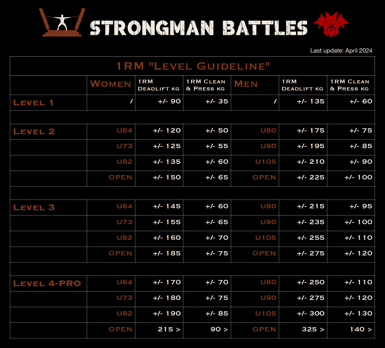 Do you have sufficient Strong(wo)man experience and do you want a level higher than what the ‘1RM Level Guideline’ indicates? No problem, have fun!